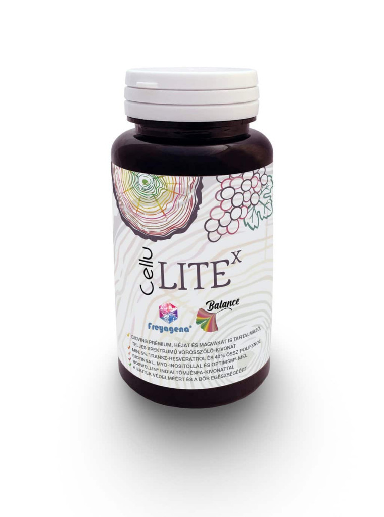 Advanced szőlőhéj és szőlőmag kivonat. Ez a teljes spektrumú kivonat jótékony növényi hatóanyagokat tartalmaz, amelyek az egész szőlőben megtalálhatók. Ezek a vegyületek, mint például az antocianinok, proantocianidinek, transz-rezveratrol, polifenolok széles körben ismertek antioxidáns tulajdonságaikról, amelyek hozzájárulnak a kötőszövetek (kifejezetten a bőr) rugalmasságához. Ez a francia vörösborszőlő kivonat minden egyes CELLU LITE kapszulában 5 (!) pohár vörösbornak megfelelő rezveratrolt biztosít. Segíti az egészséges öregedést. Segíti a szervezet antioxidáns potenciáljának támogatását. Segít fenntartani a kötőszövetek rugalmasságát, így járul hozzá (4 másik szinergikus összetevővel) a narancsbőr megelőzéséhez és enyhítéséhez.