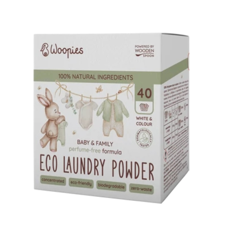 A Wooden Spoon Woopies Öko mosópor a legkíméletesebben gondoskodik a ruháidról. Ez a 100%-ban természetes, illatmentes mosópor bizonyítja, hogy a valódi tisztasághoz nincs szükség szintetikus anyagokra. A marseille-i szappan és a szódabikarbóna erejével hatékonyan távolítja el a foltokat, miközben puha tapintásúvá teszi a szöveteket.